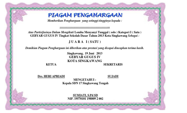 Piagam Penghargaan Juara I Solo Gebyar Gugus Iv Pdf